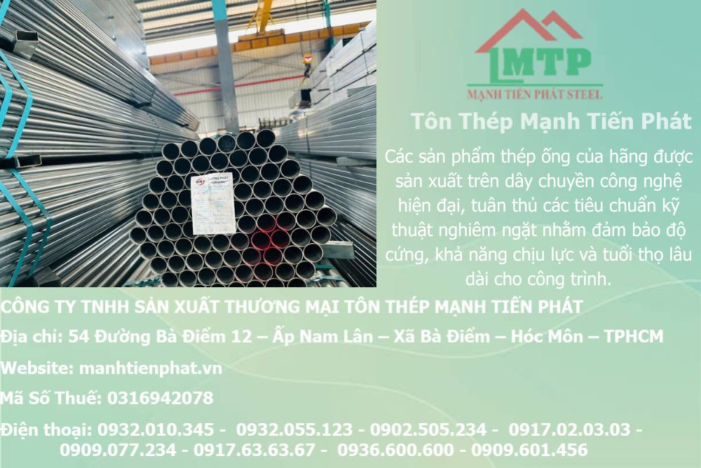 Tại Mạnh Tiến Phát, bảng giá thép ống luôn được cập nhật thường xuyên theo biến động của thị trường, giúp khách hàng dễ dàng tham khảo và lựa chọn quy cách phù hợp như ống thép đen, ống thép mạ kẽm với nhiều đường kính và độ dày khác nhau. Với nguồn hàng ổn định, giá cạnh tranh và dịch vụ tư vấn tận tình, Mạnh Tiến Phát cam kết mang đến cho khách hàng giải pháp vật tư thép chất lượng, đáp ứng tốt nhu cầu của mọi công trình lớn nhỏ trên toàn quốc.