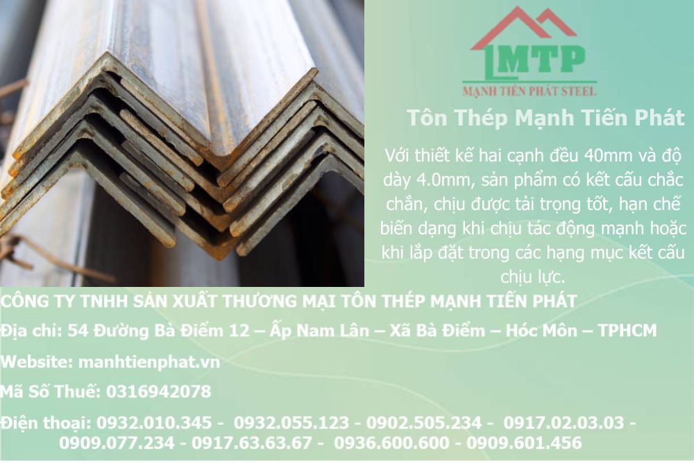 Bảng báo giá thép hình V40x40x4.0mm Á Châu ACS do Mạnh Tiến Phát cung cấp luôn được cập nhật nhanh chóng, minh bạch và sát với biến động thị trường thép hiện nay. Sản phẩm được sản xuất theo tiêu chuẩn chất lượng nghiêm ngặt, đảm bảo độ bền cao, khả năng chịu lực tốt, bề mặt sắc nét, đúng quy cách và độ dày chuẩn 4.0mm. Thép hình V40 thường được ứng dụng rộng rãi trong gia công cơ khí, kết cấu khung nhà xưởng, khung kệ, lan can, mái che, cửa sắt và nhiều hạng mục xây dựng dân dụng – công nghiệp khác.