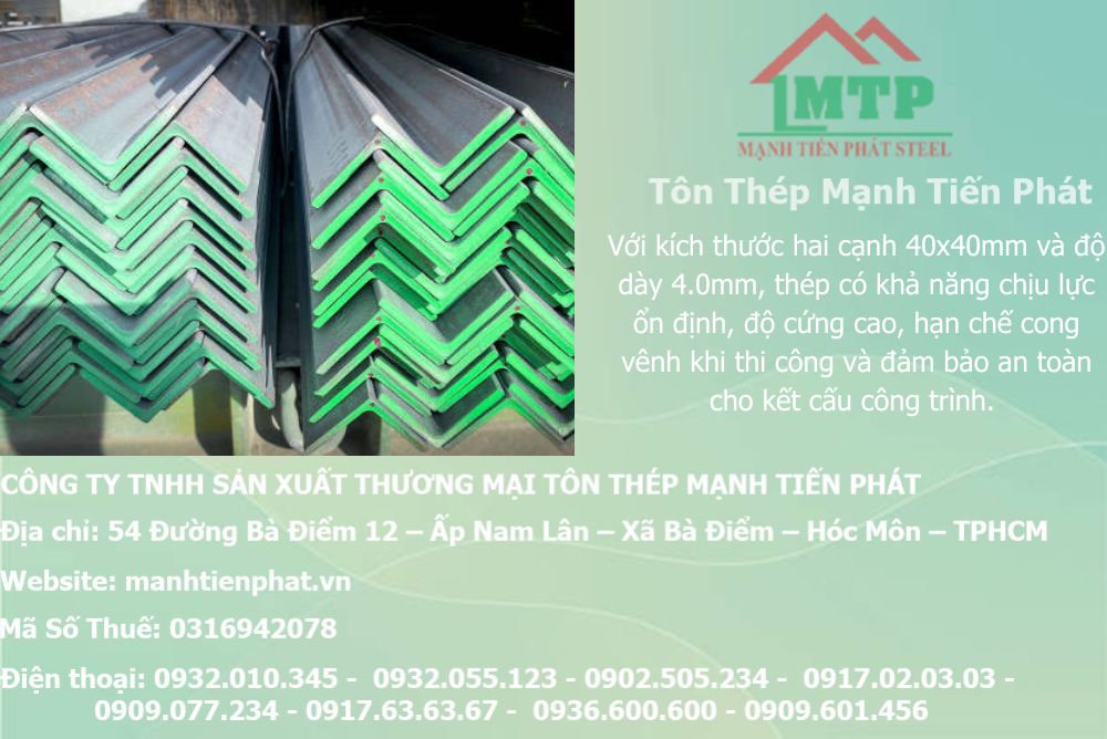 Bảng báo giá thép hình V40x40x4.0mm Á Châu ACS do Mạnh Tiến Phát cung cấp luôn được cập nhật nhanh chóng, minh bạch và sát với biến động thị trường thép hiện nay. Sản phẩm được sản xuất theo tiêu chuẩn chất lượng nghiêm ngặt, đảm bảo độ bền cao, khả năng chịu lực tốt, bề mặt sắc nét, đúng quy cách và độ dày chuẩn 4.0mm. Thép hình V40 thường được ứng dụng rộng rãi trong gia công cơ khí, kết cấu khung nhà xưởng, khung kệ, lan can, mái che, cửa sắt và nhiều hạng mục xây dựng dân dụng – công nghiệp khác.