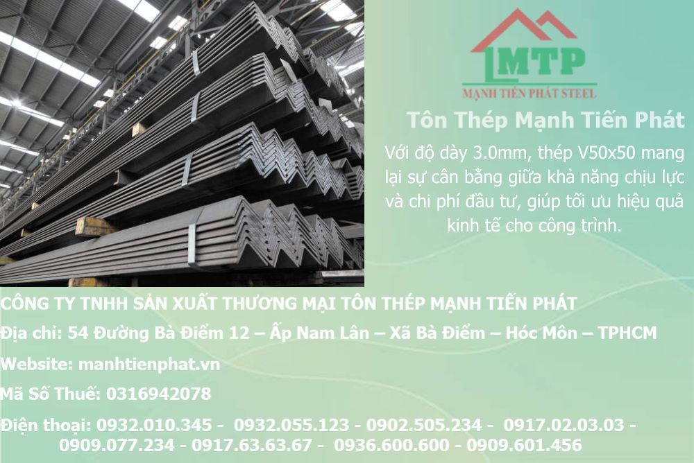 Thép hình V50x50x3.0mm, hay còn gọi là thép góc V50, sắt góc V50x50, thép L50x50x3mm (dạng cạnh đều), là loại thép có mặt cắt ngang hình chữ V với hai cạnh bằng nhau 50mm và độ dày thành 3.0mm. Chiều dài tiêu chuẩn phổ biến là 6m/cây, nhưng có thể cắt ngắn hoặc nối dài theo yêu cầu cụ thể của công trình.