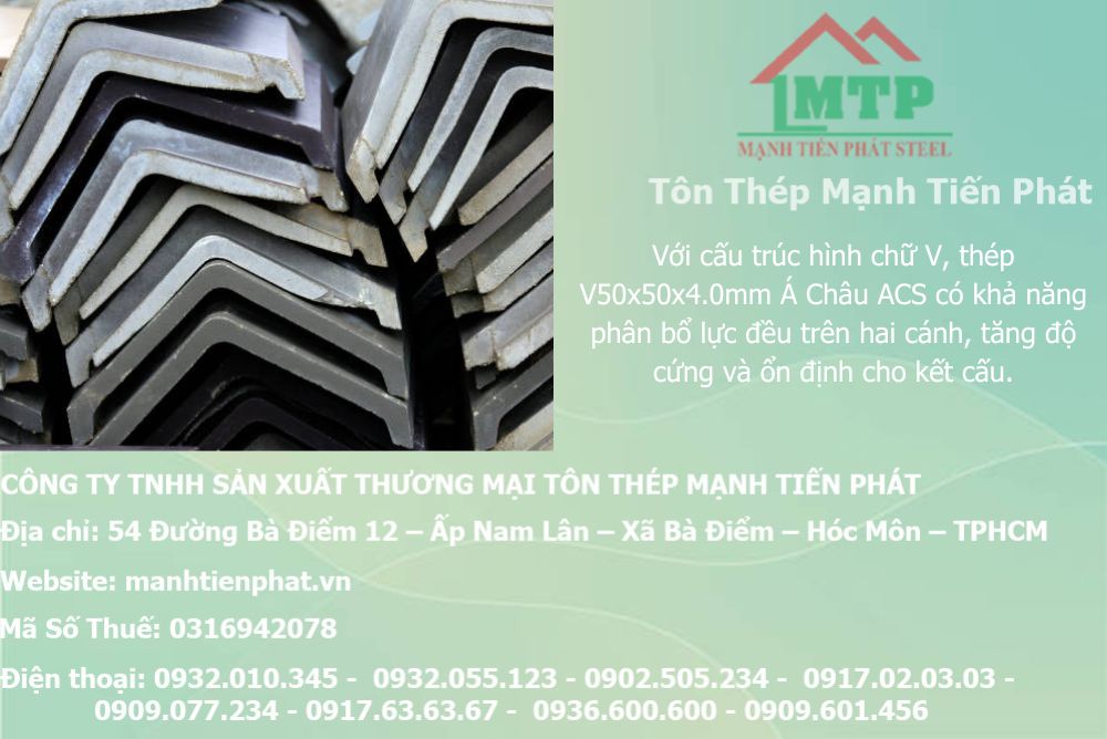 Bảng báo giá thép hình V50x50x4.0mm Á Châu ACS do Công Ty Mạnh Tiến Phát cung cấp luôn được cập nhật minh bạch, giúp khách hàng dễ dàng lựa chọn vật tư phù hợp cho các công trình xây dựng, cơ khí và kết cấu thép.