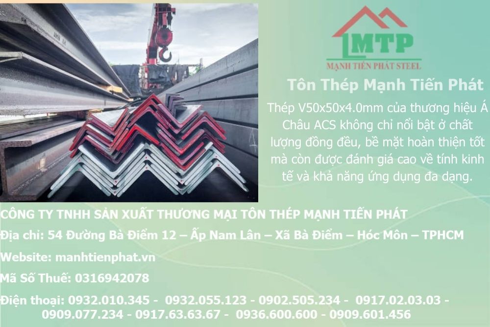 Bảng báo giá thép hình V50x50x4.0mm Á Châu ACS do Công Ty Mạnh Tiến Phát cung cấp luôn được cập nhật minh bạch, giúp khách hàng dễ dàng lựa chọn vật tư phù hợp cho các công trình xây dựng, cơ khí và kết cấu thép.