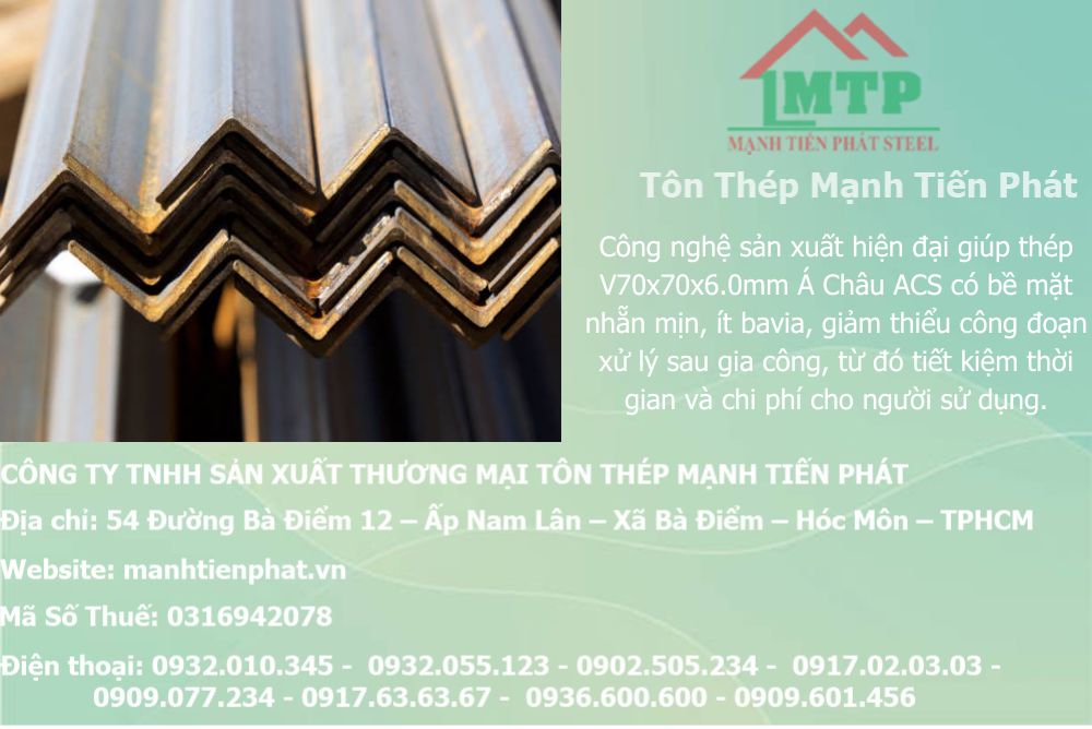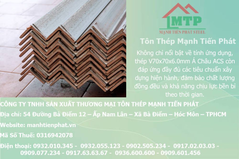 Thép hình V70x70x6.0mm Á Châu ACS là một trong những sản phẩm thép góc được ưa chuộng nhất hiện nay nhờ độ bền cao, khả năng chịu lực tốt và giá thành hợp lý. Tại khu vực Phường Tân Định, Quận 1 TP.HCM (nay thuộc quản lý Quận 1), Mạnh Tiến Phát tự hào là đơn vị cung cấp thép hình chính hãng với dịch vụ tư vấn chuyên nghiệp 24/24h, giao hàng tận nơi nhanh chóng và giá cả cạnh tranh nhất thị trường.