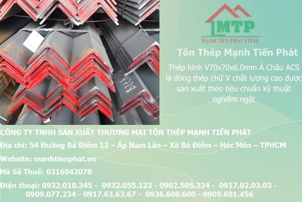 Thép hình V70x70x6.0mm Á Châu ACS là một trong những sản phẩm vật liệu xây dựng được ưa chuộng nhất hiện nay tại khu vực Phường Xuân Hòa, Quận 3 cũ, Thành phố Hồ Chí Minh. Với khả năng chịu lực vượt trội, độ bền cao và giá thành cạnh tranh, loại thép góc này đóng vai trò quan trọng trong nhiều công trình dân dụng lẫn công nghiệp. Mạnh Tiến Phát tự hào là đơn vị cung cấp thép hình V70x70x6 chính hãng từ nhà máy Á Châu (ACS), cam kết chất lượng 100%, dịch vụ tư vấn chuyên nghiệp và hỗ trợ 24/24 giờ.