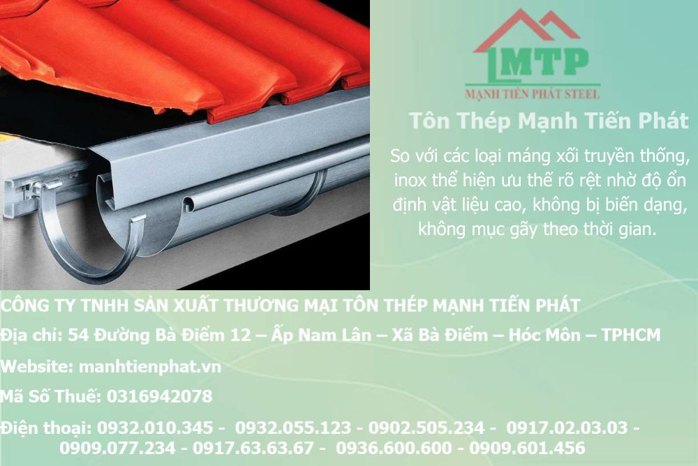 Bên cạnh đó, đơn vị còn tư vấn kiểu dáng, kích thước, độ dày phù hợp với lưu lượng nước mưa và kết cấu mái, giúp công trình vận hành ổn định, bền bỉ trước mọi điều kiện thời tiết. Nhờ quy trình làm việc rõ ràng, báo giá minh bạch và khả năng gia công theo bản vẽ, theo kích thước thực tế, Mạnh Tiến Phát luôn đáp ứng tốt các yêu cầu kỹ thuật khắt khe, mang đến giải pháp máng xối inox bền – đẹp – hiệu quả – phù hợp mọi loại công trình.