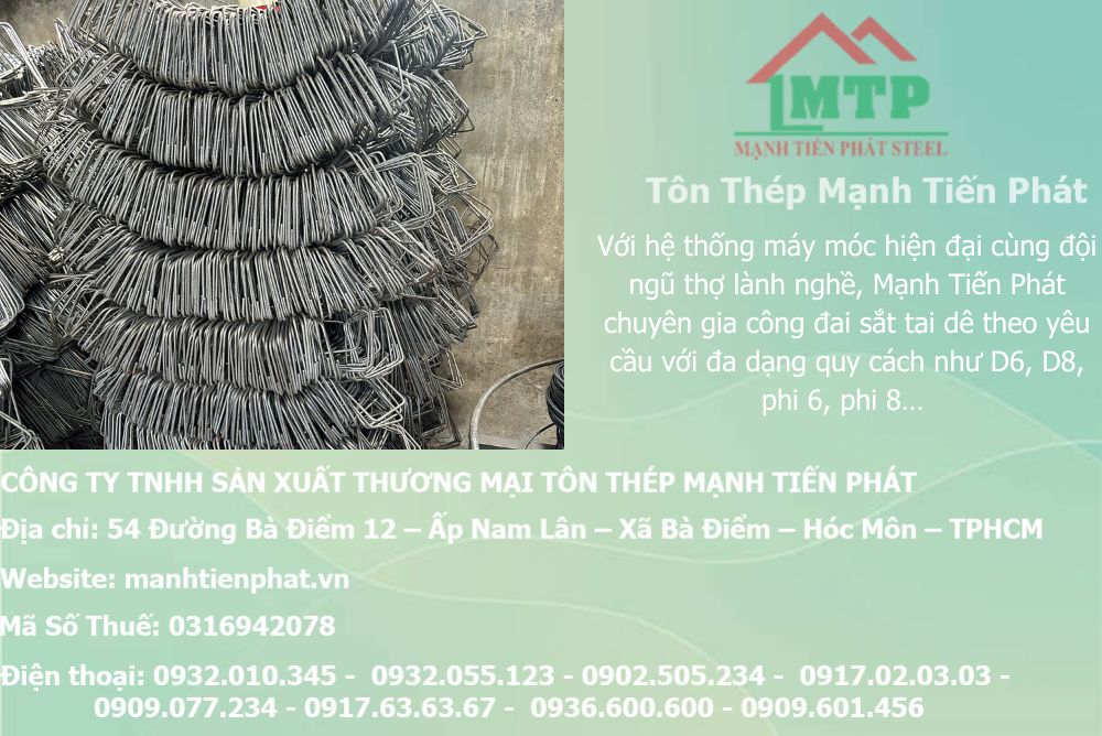 Trong ngành xây dựng hiện đại, đai sắt tai dê đóng vai trò quan trọng không thể thiếu để đảm bảo độ vững chắc cho các công trình. Nếu bạn đang tìm kiếm dịch vụ nhận gia công bẻ đai tai dê, uốn bẻ đai sắt thép theo yêu cầu với chất lượng cao và giá cả cạnh tranh nhất tại miền Nam, thì Mạnh Tiến Phát chính là đối tác đáng tin cậy. Chúng tôi là nhà máy sản xuất và cung cấp đai sắt tai dê theo bản vẽ, tư vấn hỗ trợ 24/24h, cam kết mang đến sản phẩm tốt nhất với giá rẻ nhất thị trường.