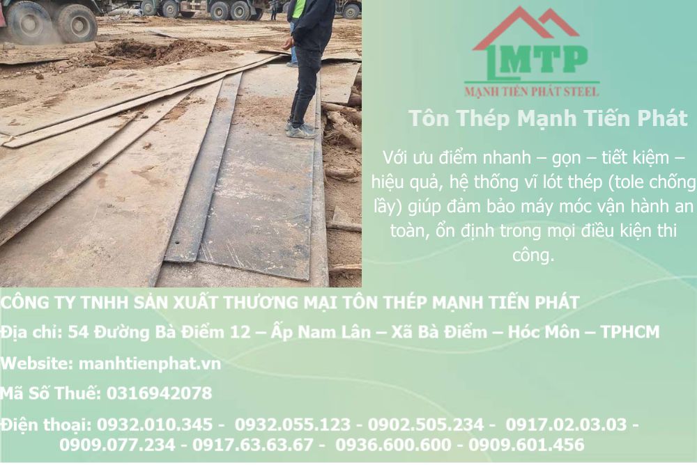 Công ty Mạnh Tiến Phát tự hào là đơn vị cho thuê vĩ lót xe máy đào, tôn tấm lót xe cuốc, xe ủi, xe lu (tole chống lầy) uy tín nhất khu vực Phường Bình Trưng Đông, Phường Bình Trưng Tây và toàn TP Thủ Đức với hơn 18 năm kinh nghiệm phục vụ hàng nghìn dự án lớn nhỏ từ khu đô thị mới, cầu vượt, hầm chui đến các công trình dân dụng và hạ tầng giao thông. Chúng tôi sở hữu kho bãi rộng hơn 12.000m² gần cầu Giồng Ông Tố, hơn 12.000 tấm lót các loại từ thép thường SS400, SS490 đến Hardox 500 cao cấp, luôn sẵn sàng phục vụ 24/7 kể cả ngày lễ Tết và mùa mưa bão.