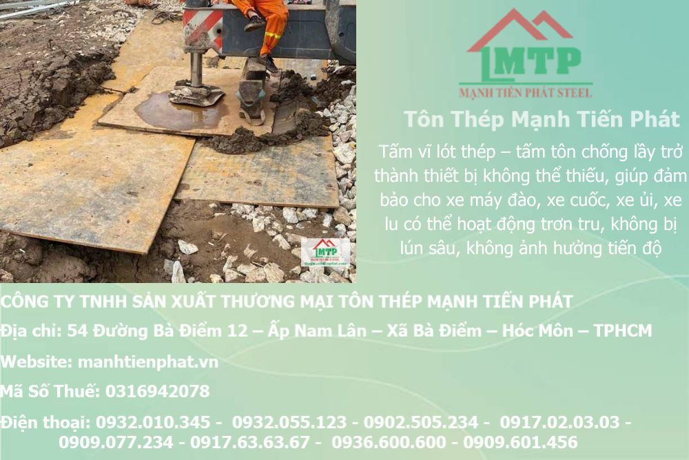 Công ty Mạnh Tiến Phát tự hào là đơn vị cho thuê vĩ lót xe máy đào, tôn tấm lót xe cuốc, xe ủi, xe lu (tole chống lầy) lớn nhất và uy tín nhất khu vực Phường Cát Lái, Thạnh Mỹ Lợi, Thủ Thiêm và toàn TP Thủ Đức với hơn 20 năm kinh nghiệm phục vụ hàng chục ngàn dự án từ cảng biển, kho bãi logistics, khu công nghiệp đến các công trình hạ tầng giao thông lớn nhất miền Nam. Chúng tôi sở hữu kho bãi rộng hơn 20.000m² gần Cảng Cát Lái, hơn 20.000 tấm lót các loại từ thép thường SS400, SS490 đến Hardox 500 cao cấp, luôn sẵn sàng phục vụ 24/7 kể cả ngày lễ Tết và mùa mưa bão.